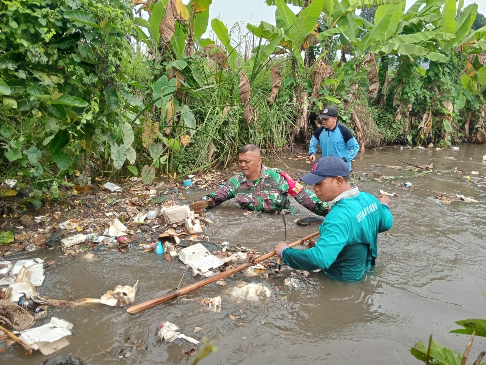 Dengan seragam loreng yang basah kuyup, para prajurit menggunakan alat sederhana seperti galah bambu dan sekop untuk mengangkat tumpukan sampah yang menyumbat aliran.