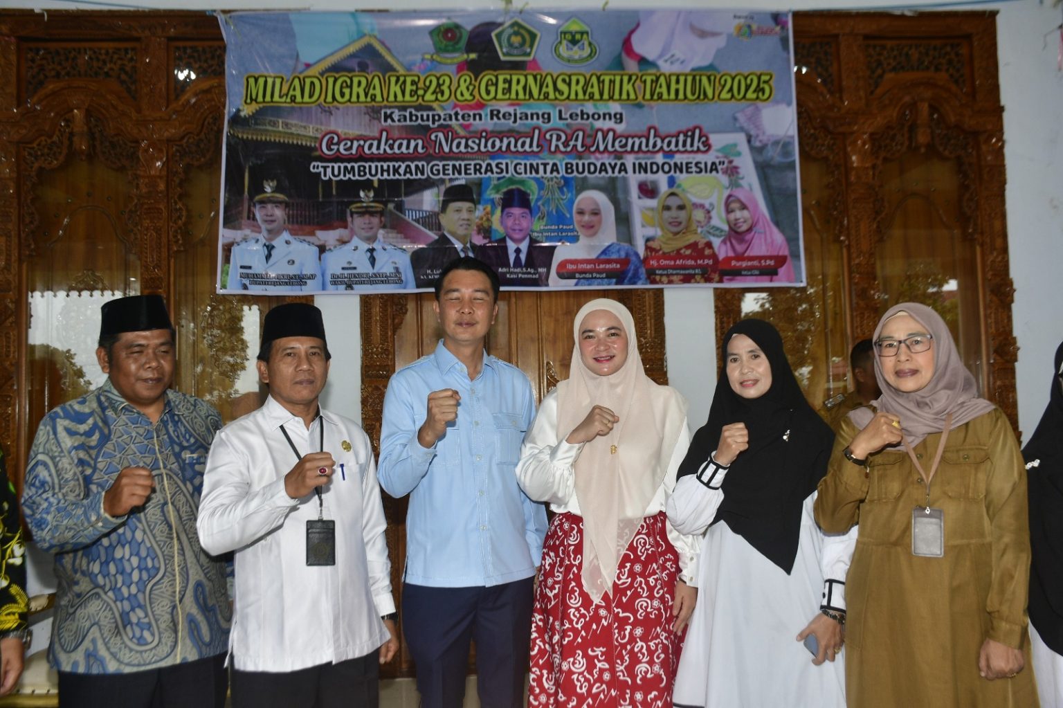 Rejang Lebong, Narasiberita.co.id.- Bupati Rejang Lebong, H.M. Fikri Thobari, S.E., M.A.P, bersama Bunda PAUD Intan Larasita Fikri, menghadiri perayaan Milad Ikatan Guru Raudhatul Athfal (IGRA) ke-23 yang dirangkaikan dengan Gerakan Nasional RA Membatik atau Gernasratik. Kegiatan ini digelar Pendopo Pat Petulai, rumah dinas Bupati. Senin pagi (06/10/2025).