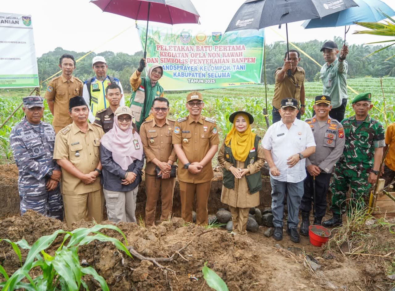Seluma, Narasiberita.co.id-  Bupati Seluma, Teddy Rahman, SE., MM., melakukan peletakan batu pertama kegiatan Opla Non Rawah sekaligus menyerahkan bantuan kepada kelompok tani Kabupaten Seluma tahun 2025, bertempat di Kelurahan Rimbo Kedui, Selasa (7/10/2025).