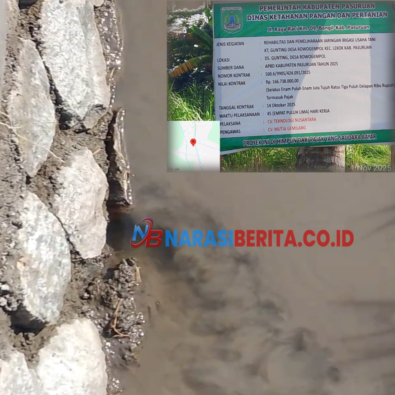 PASURUAN-Jatim, Narasiberita.co.id- Proyek pembangunan irigasi di Dusun Gunting, Desa Rowogempol, Kecamatan Lekok, Kabupaten Pasuruan, kembali menuai sorotan.