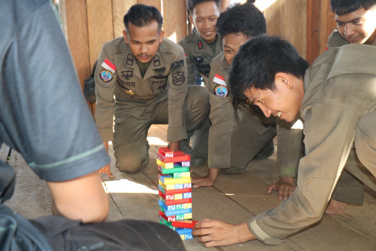 Suasana berlangsung hangat dan penuh semangat, di mana para personel terlibat aktif dalam permainan kelompok yang menuntut koordinasi, komunikasi, dan kepercayaan antaranggota.