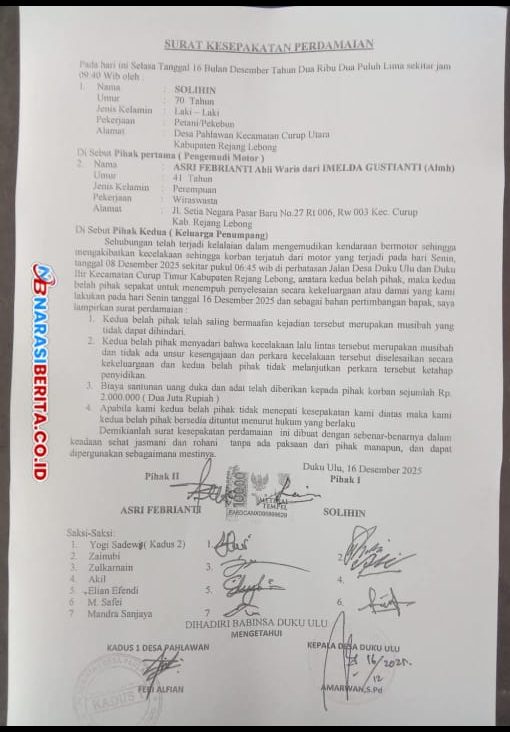 Rejang Lebong, Narasiberita.co.id.- Peristiwa kecelakaan lalu lintas yang menewaskan seorang perempuan bernama Emilda Gustianti (52) di Desa Duku Ulu, Kecamatan Curup Timur, Kabupaten Rejang Lebong, resmi diselesaikan melalui mekanisme perdamaian kekeluargaan.