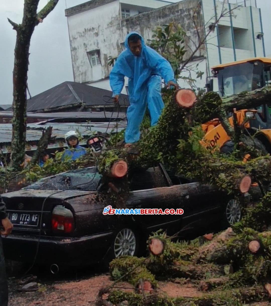 “Saya sendirian di dalam mobil. Tiba-tiba pohon tumbang dan menimpa bagian belakang mobil. Alhamdulillah saya tidak apa-apa,” katanya. (Rian) Nb