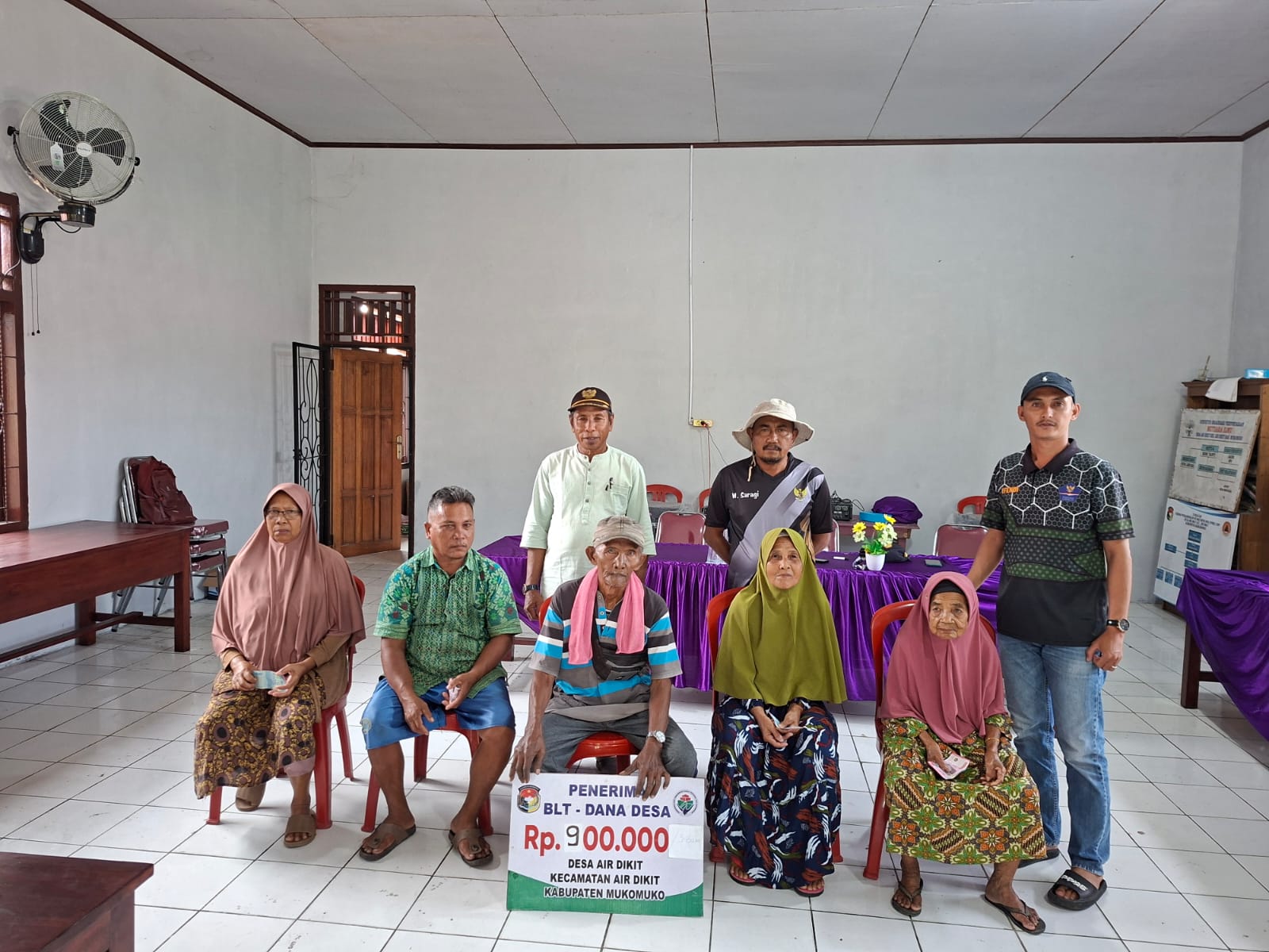 Mukomuko, Narasiberita.co.id.- Pemerintah Desa (Pemdes) Air Dikit, Kecamatan Air Dikit, menyalurkan Bantuan Langsung Tunai Dana Desa (BLT-DD) kepada 29 Keluarga Penerima Manfaat (KPM) untuk bulan Desember Tahun 2025. Penyaluran tersebut dilaksanakan pada Jumat (12/12/2025) di Aula Kantor Desa Air Dikit.
