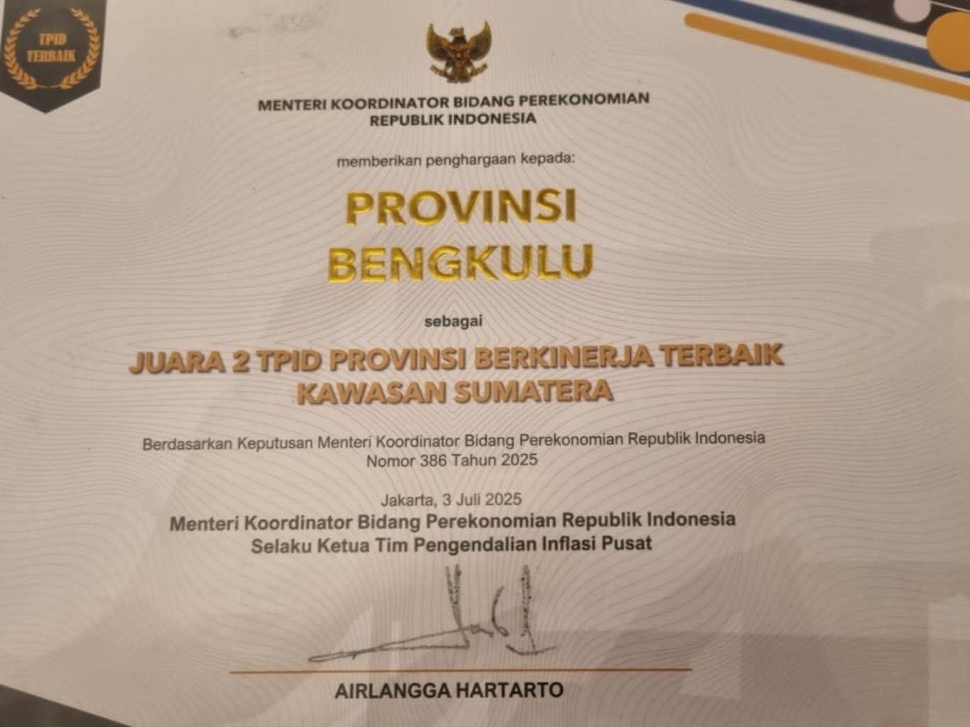Bengkulu, Narasiberita.co.id.- Pemerintah Provinsi Bengkulu kembali mencatatkan prestasi tingkat nasional dengan meraih peringkat kedua TPID Award 2025 untuk Wilayah Sumatera. Penghargaan bergengsi dalam kategori TPID Berprestasi ini diserahkan langsung oleh Menteri Koordinator Perekonomian Airlangga Hartarto, sebagai bentuk apresiasi atas keberhasilan Bengkulu menjaga stabilitas inflasi selama lima tahun terakhir.