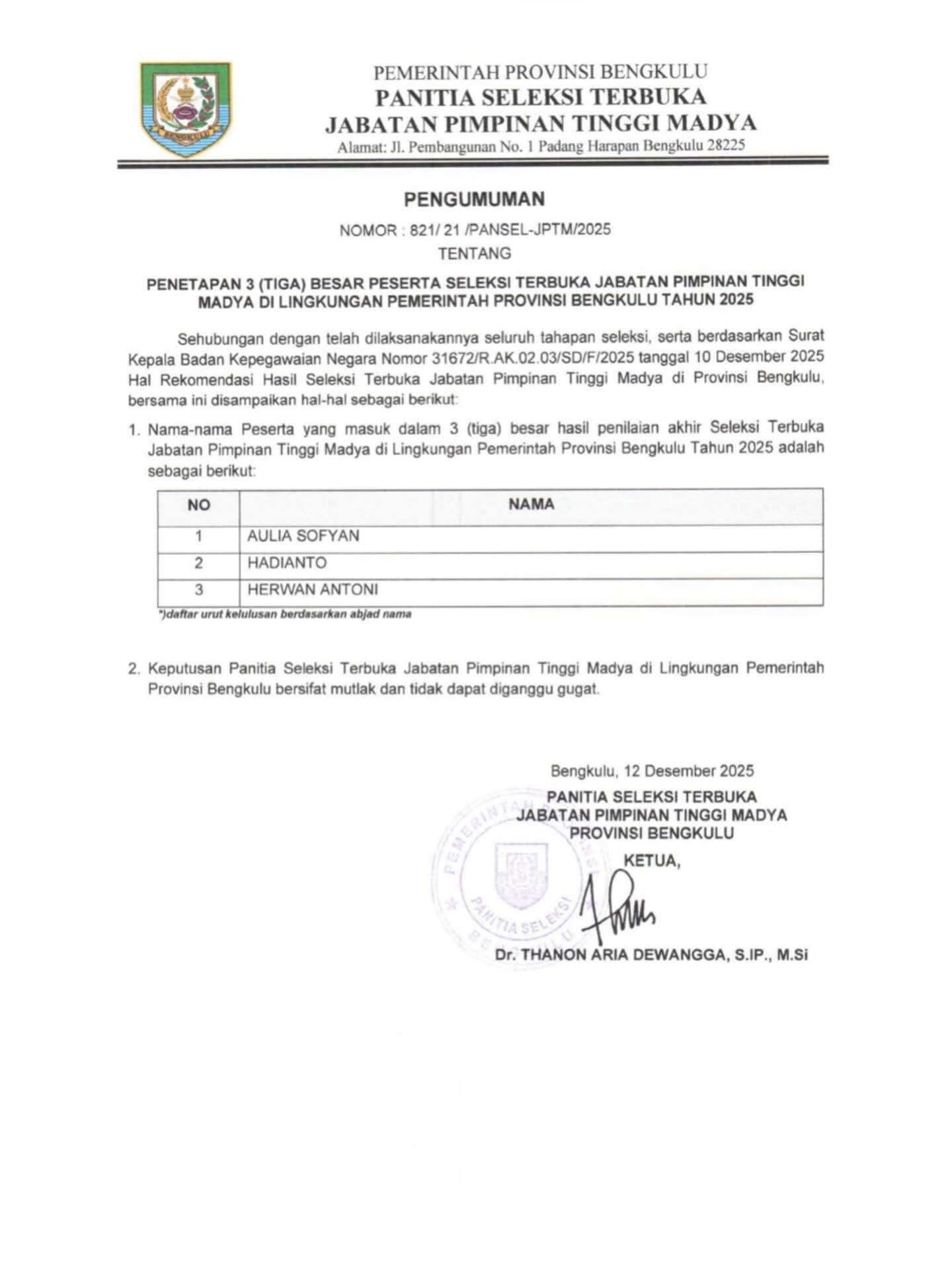 Pengumuman tersebut didasarkan pada Surat Kepala Badan Kepegawaian Negara (BKN) Nomor 3167/2R.AK.02.03/SDF/12/2025 tertanggal 10 Desember 2025 tentang Hasil Rekomendasi Seleksi Terbuka JPT Madya di Provinsi Bengkulu.