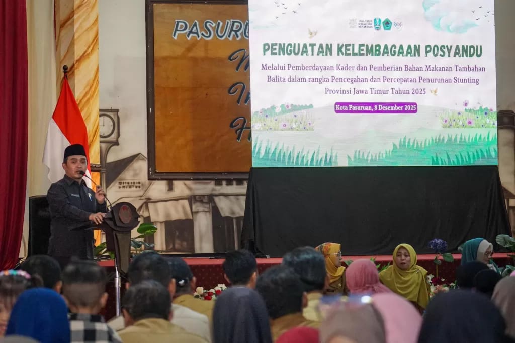 Pasuruan, Narasiberita.co.id.- Pemerintah Provinsi (Pemprov) Jawa Timur melalui Dinas Pemberdayaan Masyarakat dan Desa (DPMD) menggelar kegiatan Penguatan Kelembagaan Posyandu dan penyaluran Pemberian Makanan Tambahan (PMT) bagi balita di Gedung Gradika, Senin (8/12/2025).