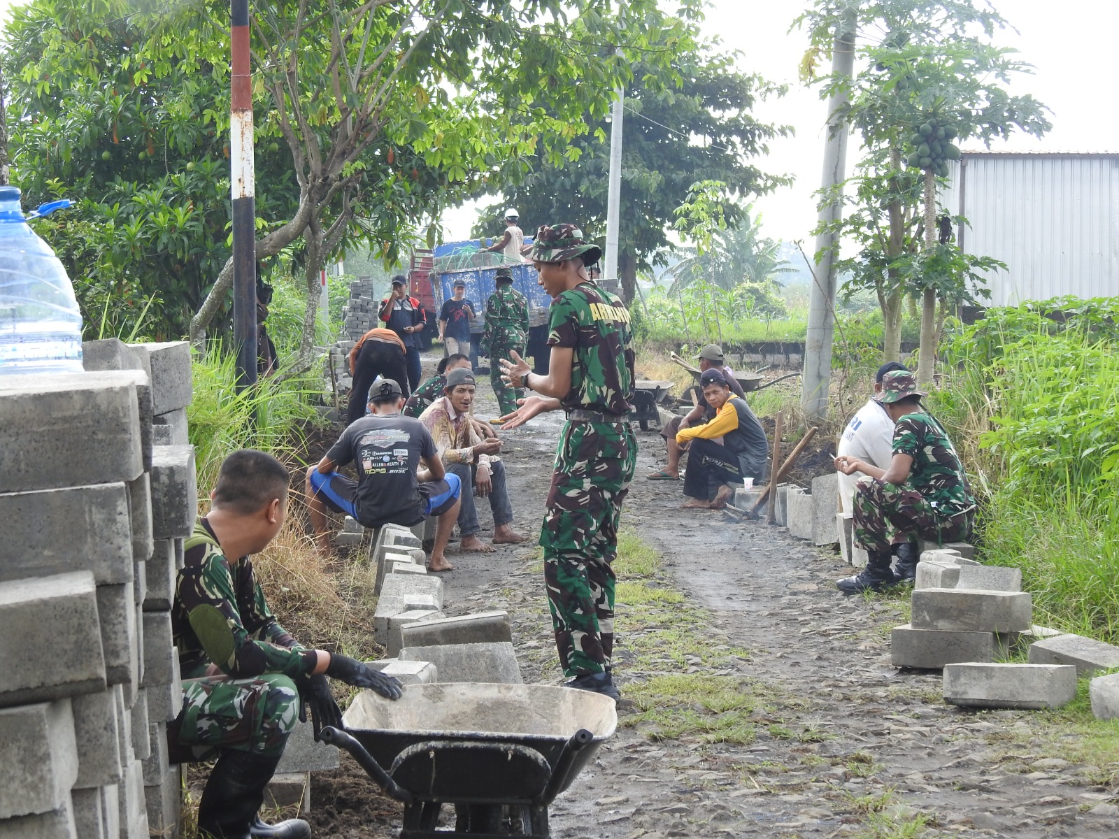 Pengerjaan paving jalan ini merupakan salah satu sasaran fisik TMMD yang bertujuan untuk meningkatkan infrastruktur desa serta memperlancar akses transportasi warga.