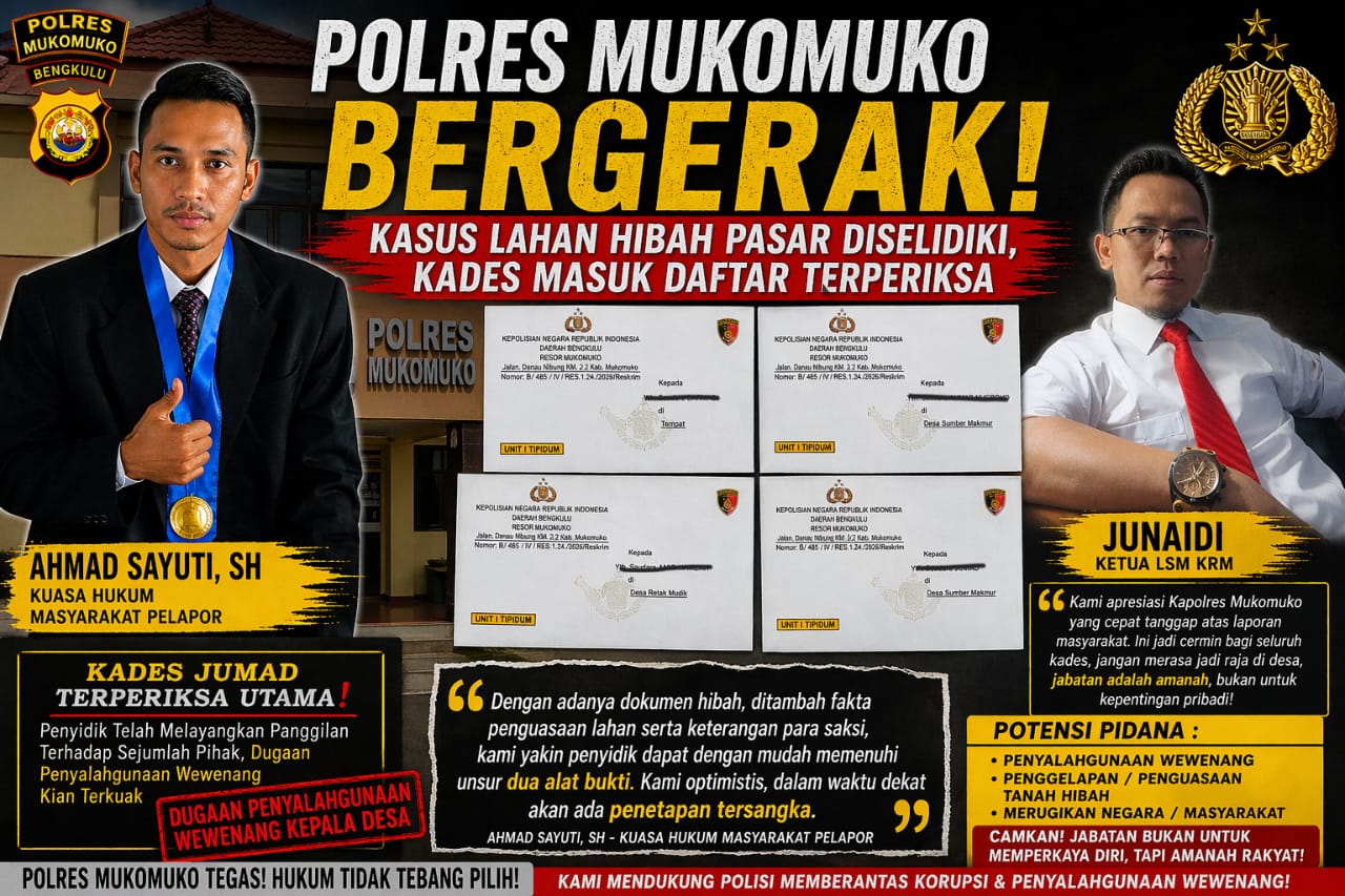 “Kami mengapresiasi Kapolres Mukomuko yang telah menunjukkan sikap tegas dan responsif. Ini memberikan harapan bahwa hukum masih berpihak pada kebenaran,” ujarnya.