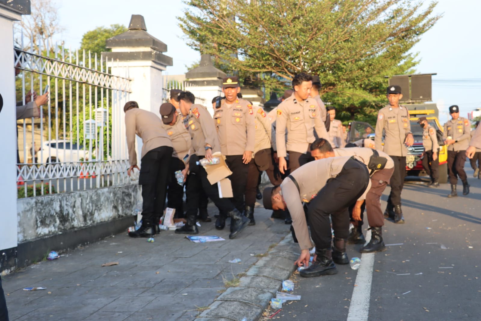 Terlihat personel kepolisian bahu-membahu mengumpulkan sampah, sisa atribut aksi, hingga berbagai barang yang tercecer di sekitar lokasi kegiatan.