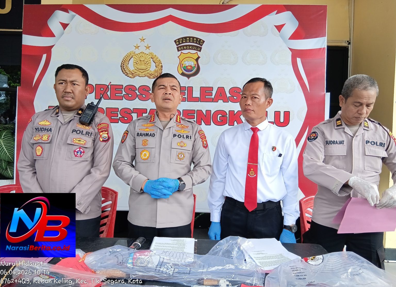 Bengkulu, Narasiberita.co.id. –. Polresta Bengkulu melalui Satuan Reserse Kriminal (Satreskrim) menggelar prese Release pengungkapan sejumlah kasus tindak pidana yang menjadi perhatian publik. Kegiatan tersebut berlangsung di Lobby Polresta Bengkulu, Senin (6/4/2026), dan dihadiri jajaran pejabat kepolisian serta insan media.