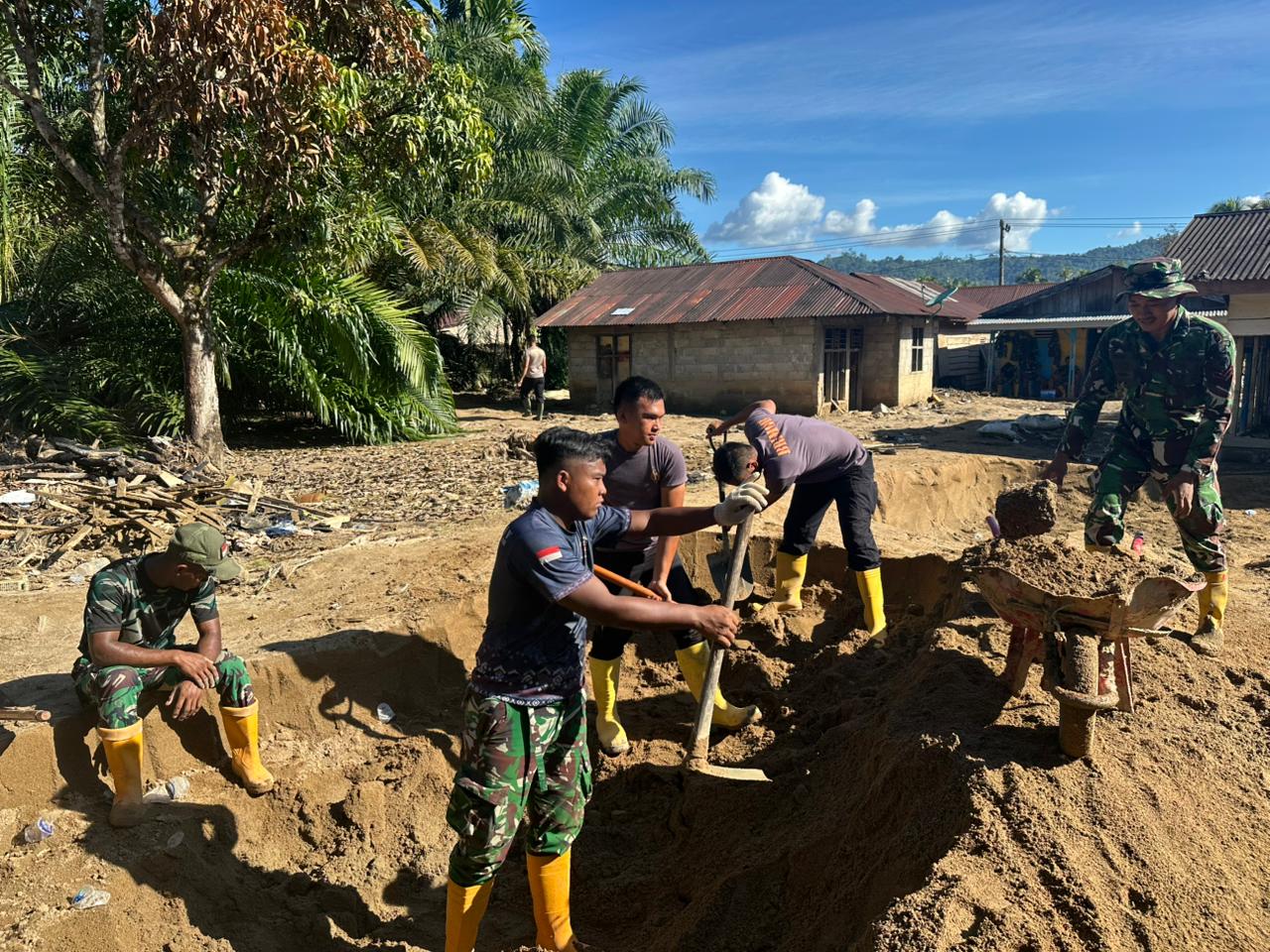 Hingga siang hari, progres pekerjaan menunjukkan hasil yang signifikan. Pembersihan rumah warga atas nama Bapak Rinto Harahap telah mencapai sekitar 40 persen, dengan material tanah yang menimbun bagian dalam rumah dimanfaatkan sebagai dasar lantai.