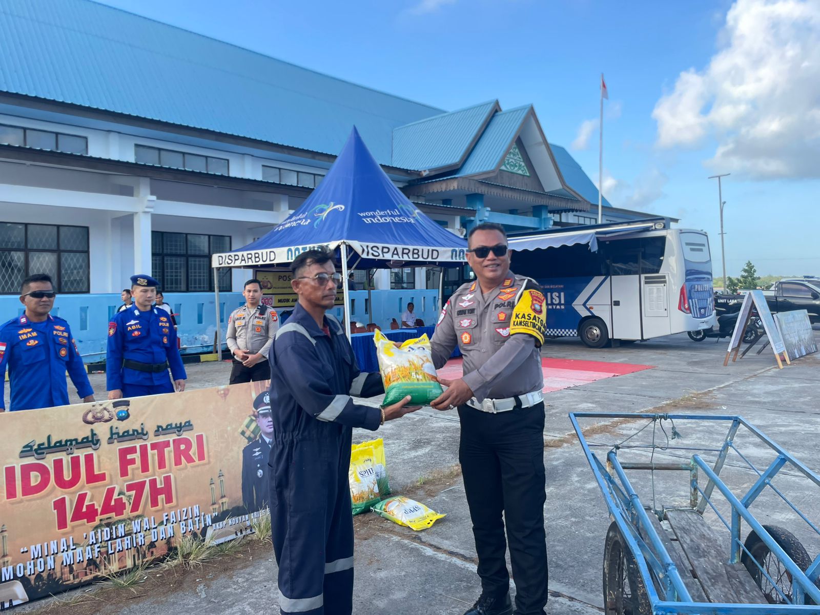 Di tengah semangat pelayanan menjelang Idul Fitri, personel kepolisian menyambangi 10 orang buruh angkut becak dorong di Pelabuhan Penagi, Ranai, Rabu (18/03/2026).