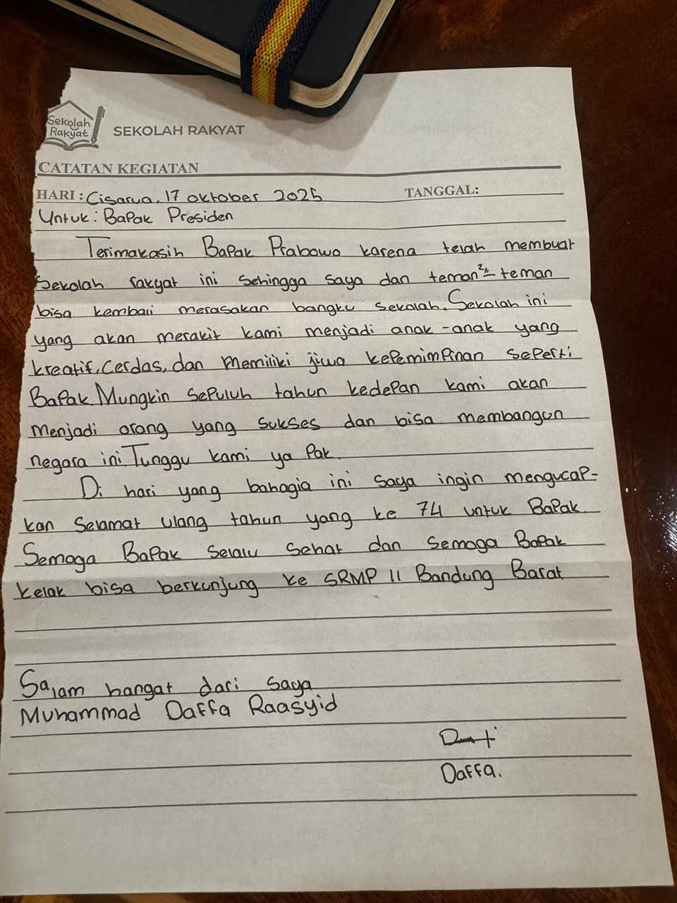 Dalam suratnya, Daffa mengungkapkan rasa terima kasih yang tulus kepada Presiden Prabowo atas kehadiran Sekolah Rakyat yang telah memberinya dan teman-temannya kesempatan untuk kembali belajar di sekolah serta merajut asa untuk masa depan.