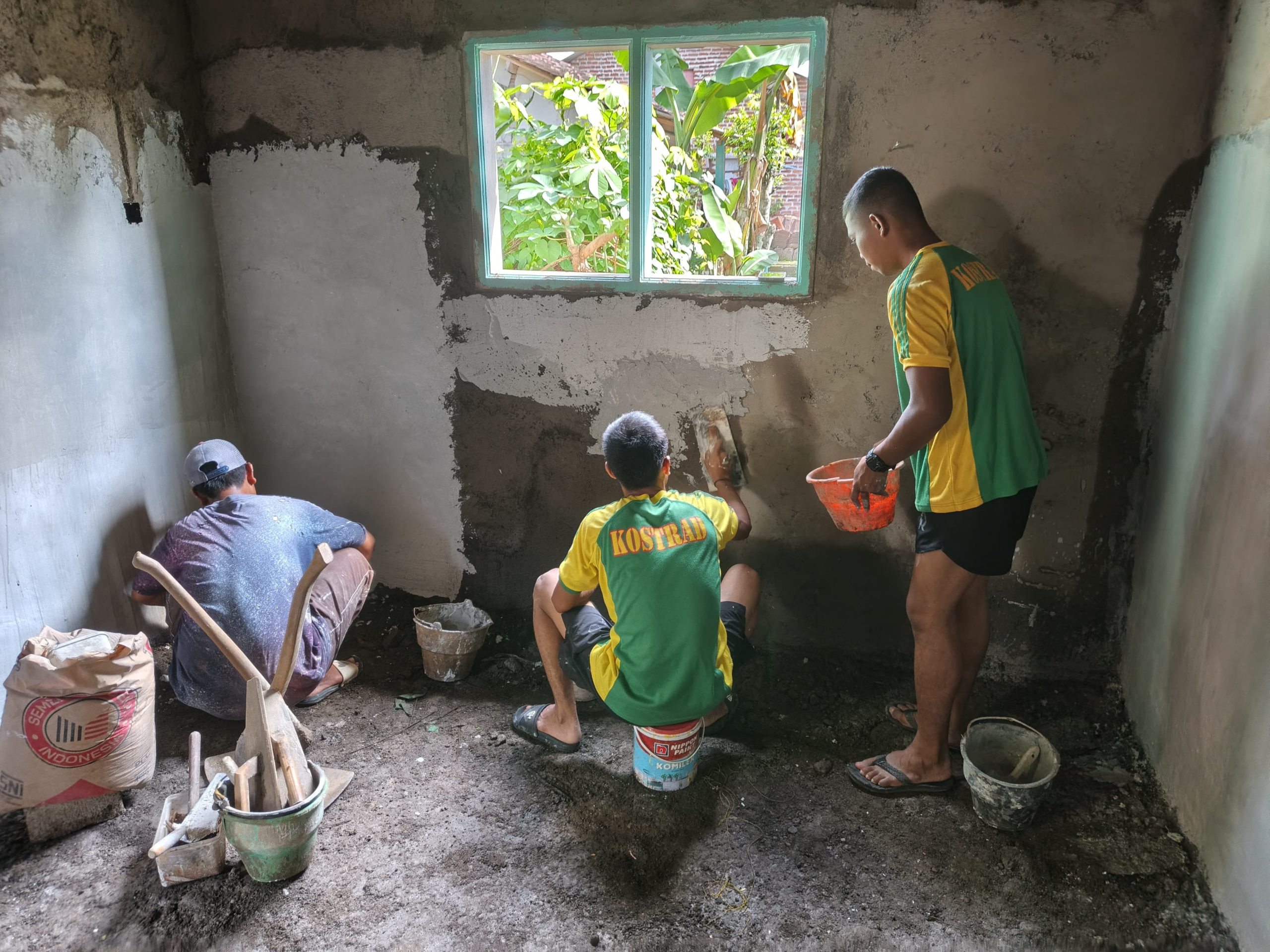 Di bawah pengawasan personel Satgas, pengerjaan plesteran dilakukan dengan penuh ketelitian. Setiap inci permukaan bata dilapisi adukan semen dengan rata agar struktur dinding terlindungi dari kelembapan, sekaligus mempermudah tahap pengecatan (finishing) nantinya.