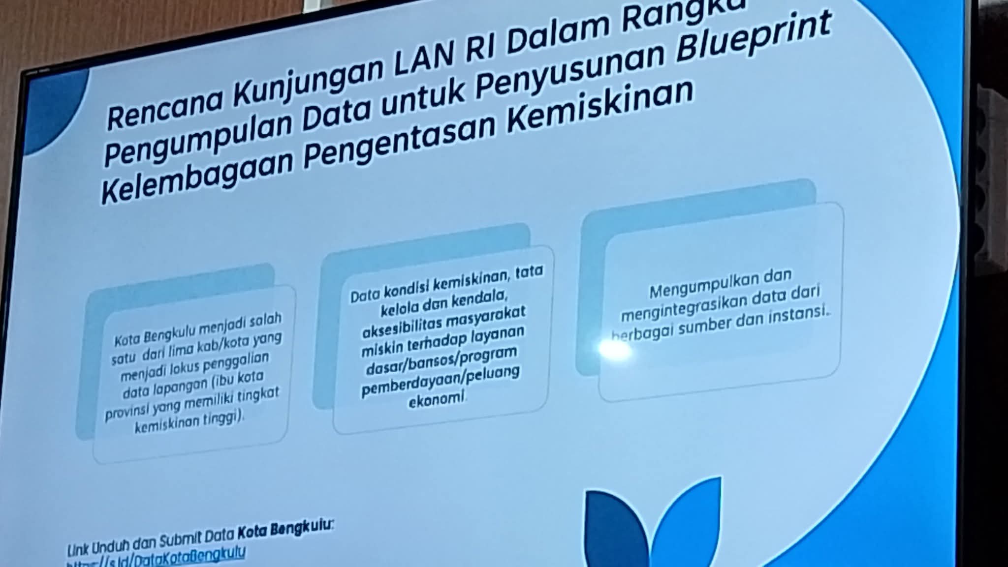 Dari Bappeda menyampaikan bahwa kunjungan LAN RI dalam rangka pengumpulan data untuk penyusunan blueprint kelembagaan pengentasan kemiskinan. Kota Bengkulu menjadi salah satu kota yang menjadi fokus penggalian data lapangan yang memiliki tingkat kemiskinan tinggi. LAN akan mengumpulkan dan mengintegrasikan data dari berbagai sumber dan instansi