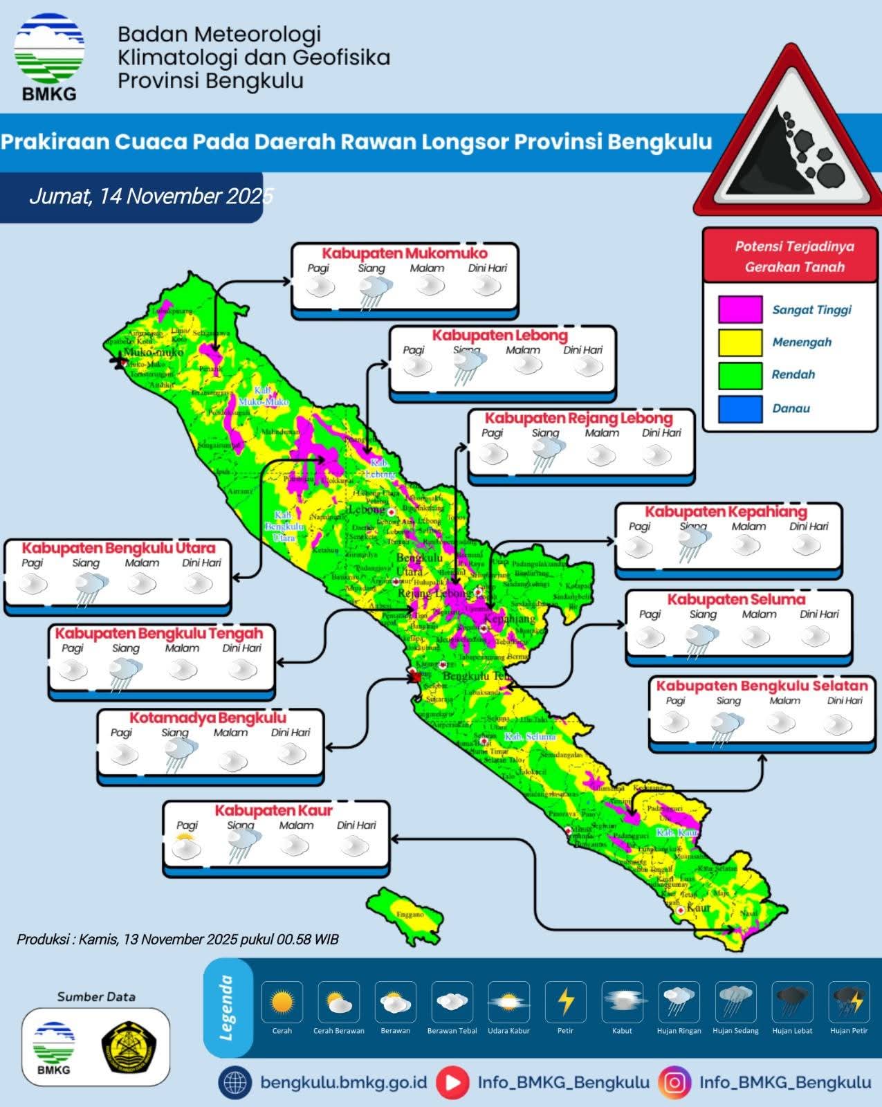 Sementara itu, berdasarkan prakiraan atau prediksi cuaca pada daerah rawan longsor Provinsi Bengkulu yang direlease BMKG, untuk daerah Kotamadya (Kota Bengkulu) hingga 3 hari ke depan Jumat Minggu masih berpotensi hujan, terutama pada Minggu, hujan akan mengguyur Kota Bengkulu sejak pagi hingga siang. (NB)