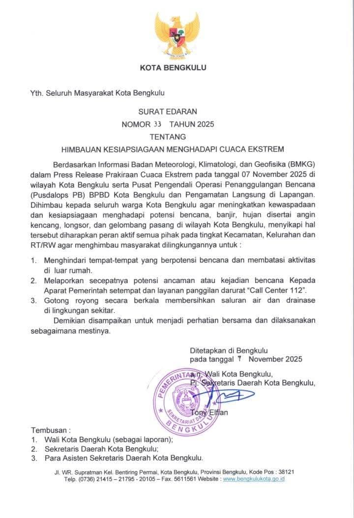 Surat edaran bernomor 33 Tahun 2025 ini diterbitkan menyusul informasi dari Badan Meteorologi, Klimatologi, dan Geofisika (BMKG) serta hasil pemantauan BPBD Kota Bengkulu dan Pusdalops PB yang mencatat meningkatnya potensi cuaca ekstrem di wilayah setempat.