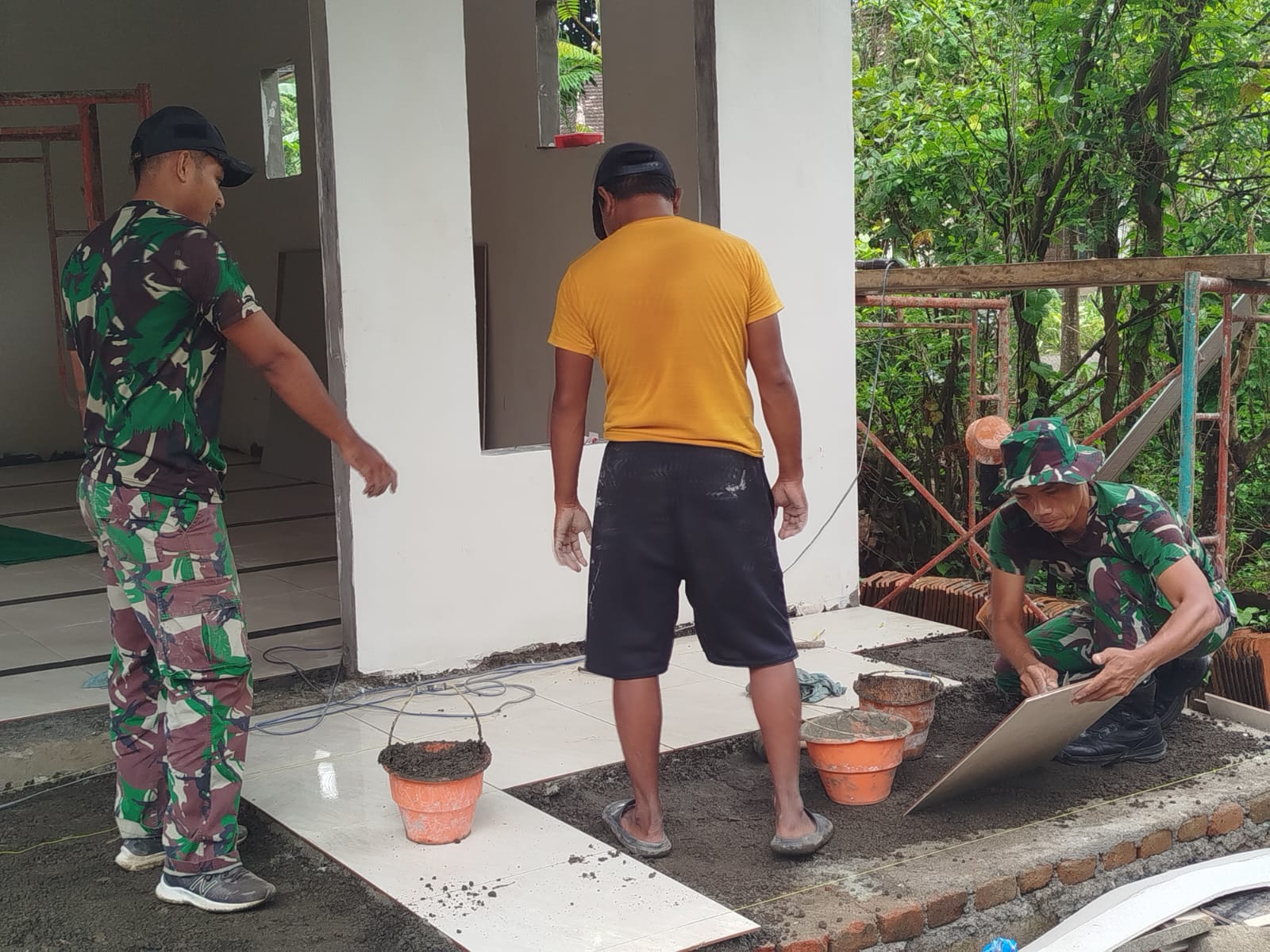 Bahu-membahu dengan warga setempat, prajurit TNI tampak telaten memastikan setiap keping keramik terpasang rata (presisi).